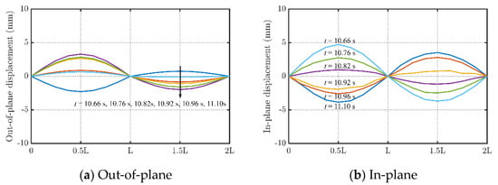 Figure 12 shows the PSD of the midspan of the conductor. The peak frequency is 1.73 Hz for both in-plane and out-of-plane displacements. When the wind speed is low, the responses are dominated by the buffeting vibration, and the values of the PSDs are very small. When the wind speed is 5.58 m/s, the displacements have one peak frequency of 1.73 Hz, especially in the out-of-plane direction. Figure 13 shows the variation mode of conductor line at a wind speed of 5.58 m/s. It is shown that the conductor line vibration dominated by the first mode. When the galloping happens, the response of the wire is narrowband vibration, and the response trajectory becomes a clear ellipse.