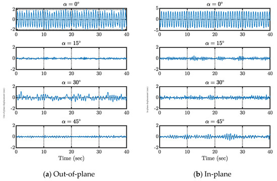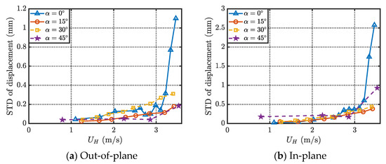 Due to the symmetry of the transmission tower-line system, only the influence of the wind direction from 0°~45° is investigated. Figure 19 shows the time histories of the midspan displacements of one of the two-span conductors at a wind speed of 3.65 m/s in different wind directions. It is shown that when the conductor has a galloping vibration at wind direction α = 0°, the response of the conductor at other directions is small and stochastic in both in-plane and out-of-plane directions. Figure 20 shows the corresponding STDs of the midspan displacement at different wind directions and wind speeds. It is shown that at wind direction α = 0°, the conductor has a galloping initiation wind speed after which the response of the conductor increases rapidly, while at other directions, the galloping phenomena does not happen. These results conform to the current design code in China (DL/T 5154-2012) [23] that the wind direction α = 0° is most prone to galloping vibration.