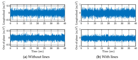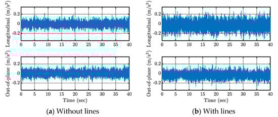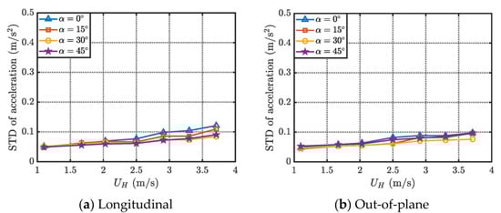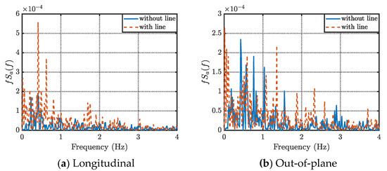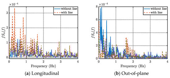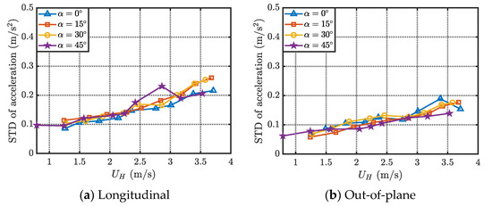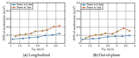 Figure 21 and Figure 22 show the time histories of the accelerations of the tower with and without conductor lines in longitudinal and out-of-plane directions at different wind speeds. Figure 23 and Figure 24 show the corresponding PSDs of the accelerations of the tower. It is noted that the acceleration response time histories of the tower are stochastic vibration, the values of the corresponding PSDs are small, and no narrow-band feature is shown in the PSD. The tower without lines has a buffeting response. The tower with lines also has a buffeting response at low wind speed and at wind speed when the conductor lines have a galloping vibration. Figure 25 shows the STDs of the accelerations of the tower with and without lines. The STDs of the accelerations of the tower are very low and are slightly increased when connected to the conductors. The influence of the conductor lines on the response of tower is trivial.