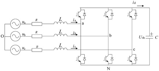 The rectifier on the machine side uses the most common IGBT three-phase full-bridge rectifier. Its structure is a voltage rectifier, and its main function is to convert the variable-frequency AC power generated by the permanent magnet synchronous generator into DC power. The three-phase full-bridge rectifier circuit topology is shown in Figure 2.