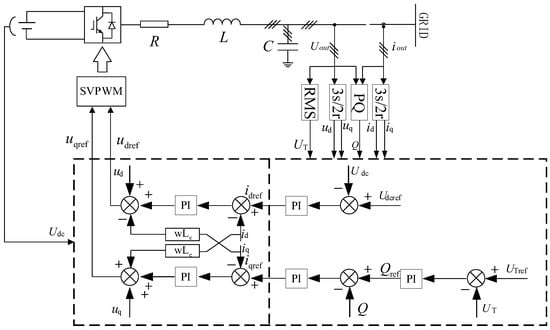 For this reason, grid-side inverters generally use a voltage and current double-loop control strategy based on grid voltage orientation. The outer loop control not only includes DC bus voltage control, but also reactive power control. The goal of the outer loop DC bus voltage control is to maintain a constant DC-side voltage, while the goal of reactive power control is to regulate the grid-connected power factor. The inner loop only includes current control, and the final output voltage is generated through current inner loop control and decoupling [20]. Therefore, the outer loop voltage and reactive power control equations are as follows: