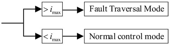 Fault ride-through control protection switching judgment control is shown in Figure 6. In order to avoid overcurrent damage to the grid-side converter of a direct-drive wind turbine, the grid-side converter usually limits the maximum converter current to 1.1–1.2 pu. When the current reaches the limit value, the drop is very close to the fault ride-through starting voltage. Therefore, it can be considered that the input of the converter fault ride-through control is related to whether the output current of the grid-side converter reaches the limiting value. When the grid-side output current reaches the maximum limiting current of the grid-side converter, the fault ride-through control protection is enabled, otherwise it is not enabled.