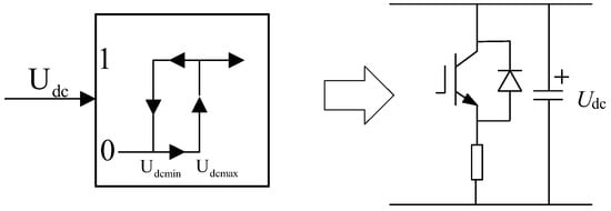 The chopper protection switching judgment control is shown in Figure 7. To prevent overvoltage of the DC bus capacitor, chopper protection is provided on both sides of the DC bus capacitor. Chopper protection switching generally uses hysteresis control. When the DC bus voltage exceeds the maximum operating voltage Udcmax, the chopper is engaged, and when the DC bus voltage is lower than the minimum operating voltage Udcmin, the chopper is disconnected [21].