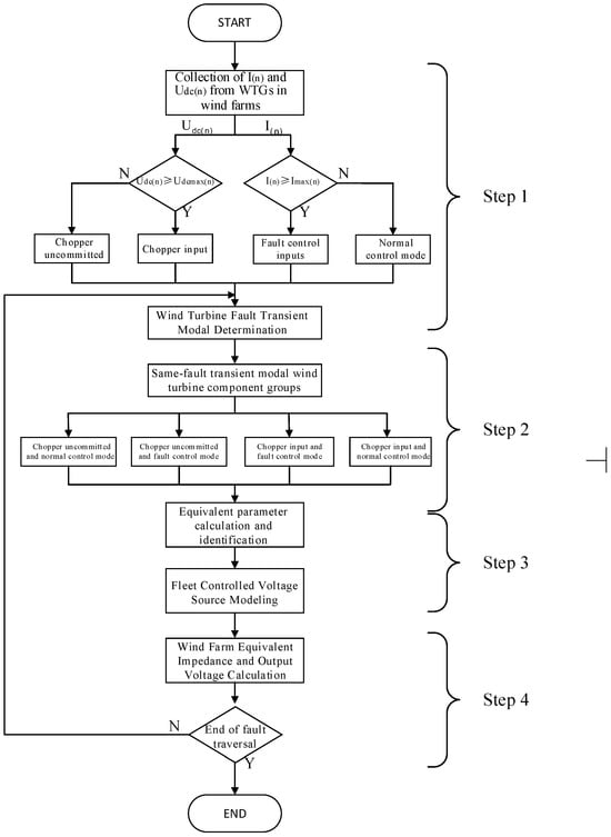 To address this issue, this paper proposes a multi-machine equivalent modeling method based on the fault ride-through control characteristic subgroup of direct-drive wind turbines. First, a single-machine fault transient model is constructed by analyzing the protection action characteristics of direct-drive wind turbines during the fault ride-through process. Then, based on the characteristics of the chopper protection and converter fault ride-through control actions of the units during wind farm faults, the units within the wind farm are grouped. By combining the existing single-machine fault transient model and the parameters of the units within each group, weighted aggregation and the QPSO algorithm are used to optimize the aggregated units. The QPSO algorithm possesses strong global optimization capabilities in multi-objective optimization problems and can effectively avoid local optima, making it particularly suitable for the optimization task of wind farm equivalent modeling [14,15,16].