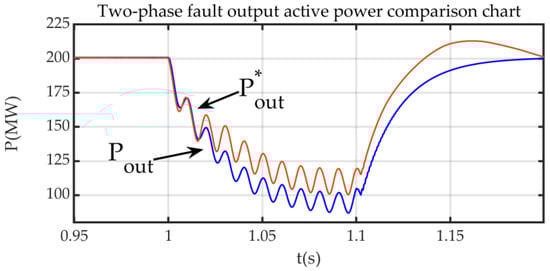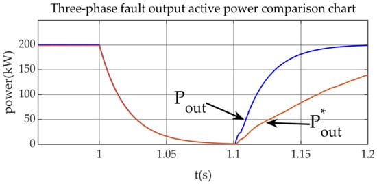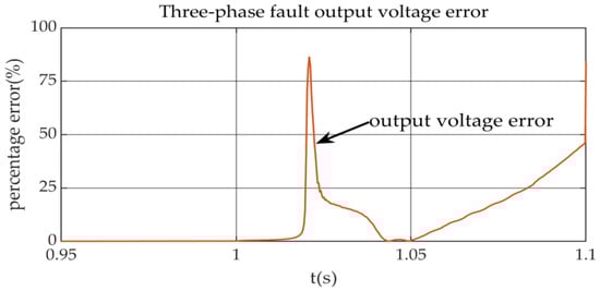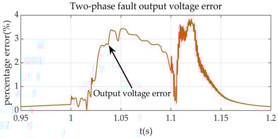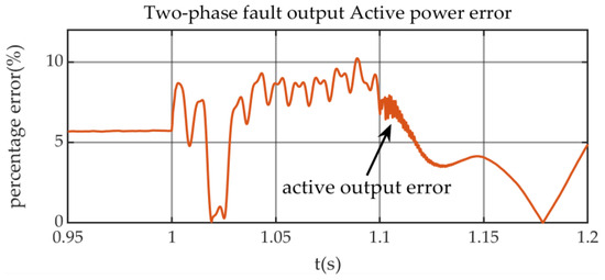 Figure 17 and Figure 18 show the waveform comparison and error analysis of the machine-side output active power between the detailed model and the equivalent model under three-phase fault conditions. Figure 19 and Figure 20 show the waveform comparison and error analysis of the machine-side output voltage between the detailed model and the equivalent model under three-phase fault conditions. It can be seen from Figure 17 and Figure 19 that after a two-phase short circuit fault occurs in 1 s, the detailed wind farm model’s machine-side output voltage drops rapidly to 0.027 pu, and the active power output of the detailed direct-drive wind farm model from the steady state of 200 MW quickly dropped to around 1.2 MW. The speed of the active power drop showed a trend of first being fast, then becoming stable, until the active power reached its lowest value at 1.1 s, at which time the active power output of the wind farm was approximately 0.45 MW.