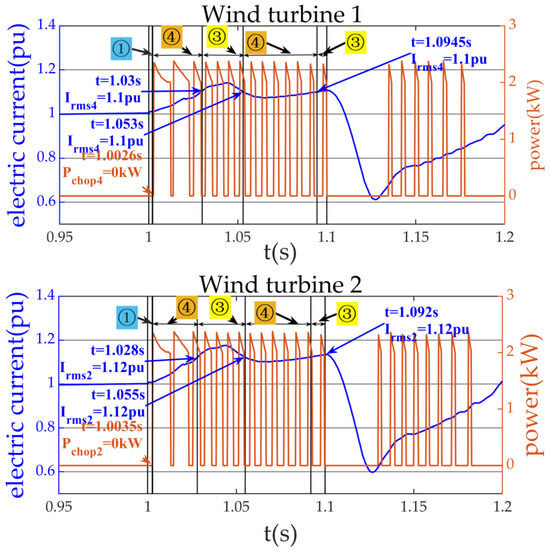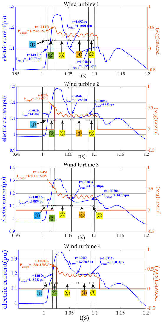Figure 16 shows the 100 ms transient region diagram of the four types of units within the wind farm fleet under a two-phase fault. The fault transient of each group of units can be divided into four regions, where ①, ②, ③, and ④ represent the fleet being in the modes: ① chopper engaged with fault ride-through control not engaged, ② chopper not engaged and fault ride-through control engaged, ③ chopper and fault ride-through control both engaged, and ④ neither chopper nor fault ride-through control engaged. It can be seen from the figure that after a two-phase fault and short circuit occurs in the wind farm, the change sequence of the modal types of each group of wind turbines during the transient process is the same, starting from the beginning of the fault: chopper and fault ride-through control not put into use—chopper is not put into use but fault ride-through control is—chopper and fault ride-through control are both put into use—chopper is put into use and fault ride-through control is not put into use. However, there is also a difference in the time of change in the modal types of each group of wind turbines in the wind farm. This is due to the different maximum output currents of the grid-side converters and the operating voltages of the protection circuits in each group of wind turbines, as well as the different distances from the fault point. The conclusion that the modal change times are different is consistent with the wind farm modelling approach envisaged in this paper.