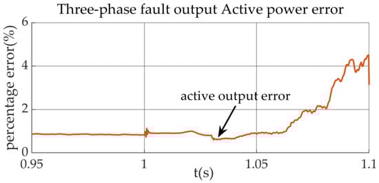 In addition, by comparing the detailed model and equivalent model machine-side output active power and output voltage waveforms in the 100 ms transient region after a fault occurs, it can be seen that the equivalent model machine-side output active power and voltage trends are consistent with the detailed model. However, according to the error data of the output active power and voltage in Figure 18 and Figure 20, it can be concluded that during the 100 ms transient time after the fault occurs, the maximum percentage error of the active power of the equivalent model does not exceed 0.1. The active power meets the verification requirements, but the side output voltage has a maximum percentage error of 85%, and its error value cannot meet the model verification requirements. A possible reason for this result is that the voltage drop due to a three-phase fault is too large, and the detailed model output voltage value is close to 0, making the denominator too small during the calculation of the voltage error, thus causing the output voltage error to be too large during the fault transient process.