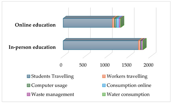 The pandemic also provided an opportunity to examine the impact of distance education on carbon footprint. Many universities (De Montfort University, University of British Columbia) have been assessing their carbon footprint, with studies published in scientific journals. Different methods [33,34], such as the consumption-based carbon footprint definition and input–output analysis, have been used to determine the carbon footprints of institutions.