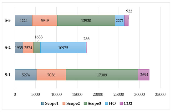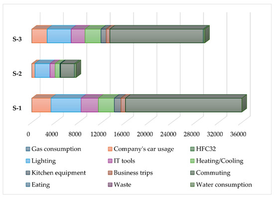 Table 3 presents the three scenarios and three scopes for the work. The S-3 scenario is based on the actual data of S-1 and S-2. The comparison is performed in a complete system, i.e., it considers the elements of working at home that were taken into account when working at the workplace (heating, energy use, etc.). The LCA-based approach to the carbon footprint and the analysis and comparative evaluation of the S-1, S-2, and S-3 scenarios made it possible to determine hot spots and decarbonization paths.