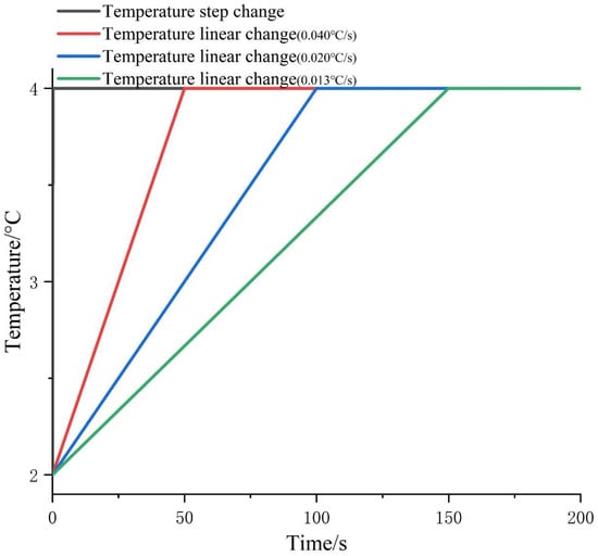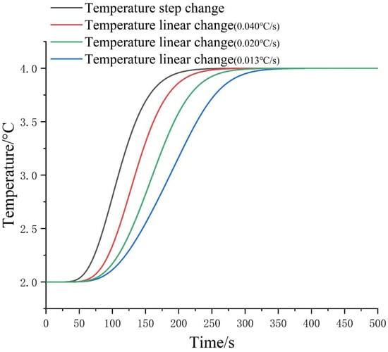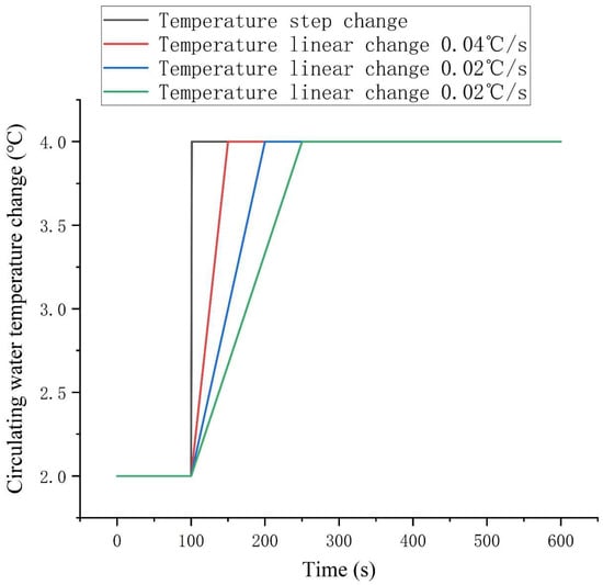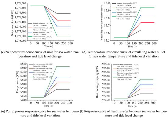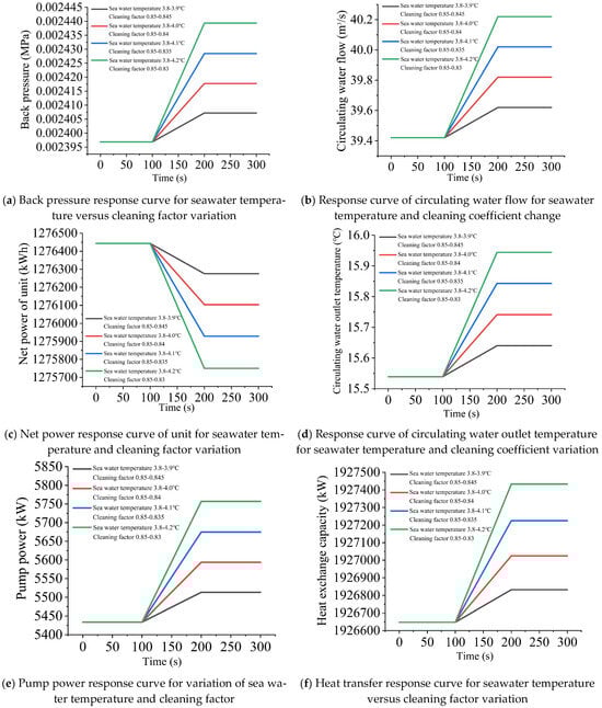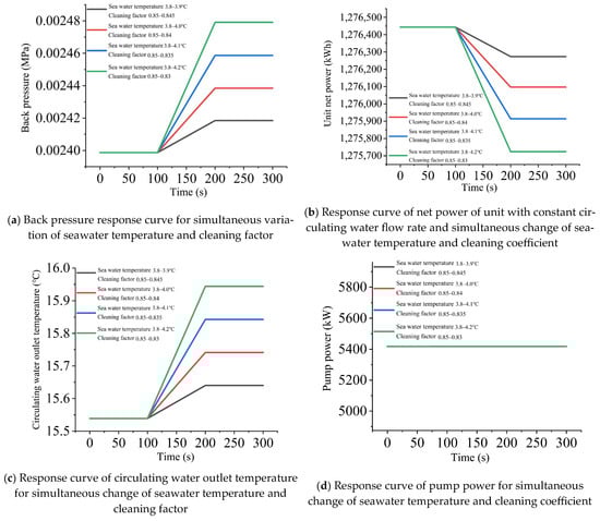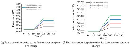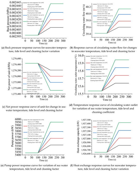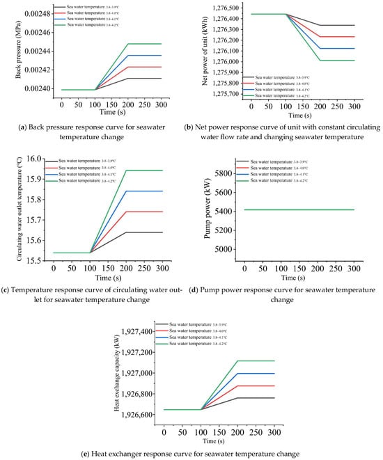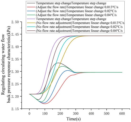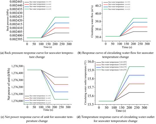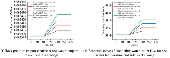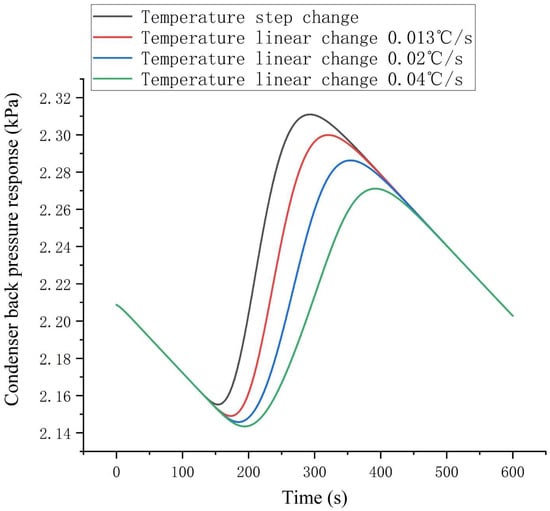 Figure 25 shows the dynamic response of the condenser inlet circulating water temperature under different temperature change rates. The seawater temperature change is transmitted to the condenser inlet in about 140 s. When the seawater temperature fluctuates faster, the transfer of circulating water in the pipeline is quicker. In contrast, when the seawater temperature changes linearly, the transfer time is longer, and the temperature change at the condenser inlet is slower with a smaller change rate.