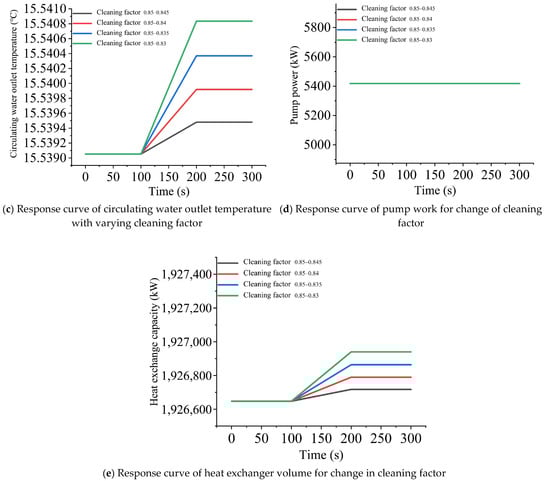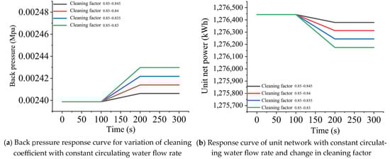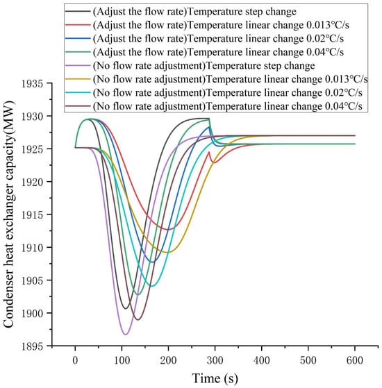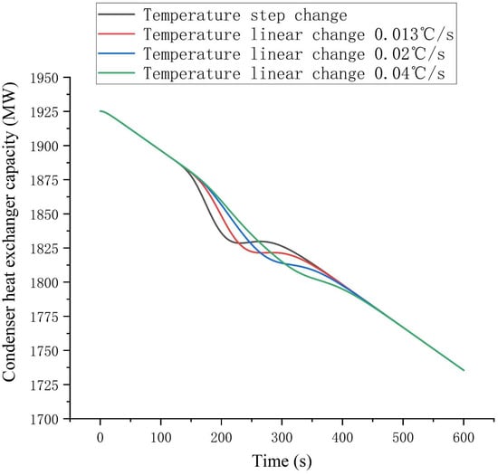 Figure 28 shows the dynamic response of condenser heat exchange under different temperature change rates. The condenser heat exchange is proportional to the product of turbine exhaust flow rate and the latent heat of vaporization corresponding to the condenser back pressure. During the decrease in exhaust flow, the overall condenser heat exchange shows a downward trend. As the circulating water temperature rises, changes in back pressure affect the latent heat of vaporization. When back pressure decreases, latent heat increases, and, when back pressure increases, latent heat decreases. Thus, between 140 and 400 s, the condenser heat exchange fluctuates as shown in the Figure 28.