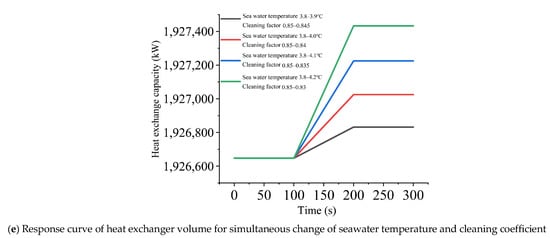 In contrast, when the circulating water flow rate is increased (variable frequency operation), the outlet temperature initially decreases because the flow rate increase compensates for the inlet temperature increase. However, once the seawater temperature starts to rise, the outlet temperature increases, with a shorter duration of the initial decrease as the inlet temperature rises faster. The faster the inlet temperature changes, the quicker the outlet temperature increases. Over time, the outlet temperature starts to stabilize and decrease as the flow rate response lags behind the inlet temperature change, while the influence of flow rate changes becomes stronger as the rate of temperature increase slows [37,38].