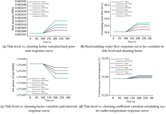 Considering these constraints, the study by Wang et al. [21] investigated the dynamic thermal response of cooling water systems under complex operating conditions using a detailed mechanism-based model. Key research areas include analyzing the heat transmission process in circulating water pipelines, assessing system sensitivity to nonlinear disturbances, and exploring adaptability to environmental changes. For example, seawater temperature fluctuations (up to 0.4 °C), tidal level variations (up to 47 m), and condenser cleanliness degradation are considered.