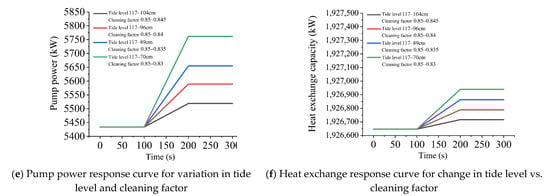 When the tide rises, the geometric head decreases, reducing piping resistance and increasing flow; conversely, when the tide falls, the geometric head increases, raising resistance and decreasing flow. These tidal fluctuations can cause up to a 2% change in flow rate twice daily, impacting energy efficiency. Changes in resistance also affect pump flow regulation and the system’s flow stability. At low tide, the increased pump resistance results in reduced flow and higher condenser pressure, while, at high tide, the reduced resistance allows for increased flow, lowering the condenser pressure. These tidal effects cause the condenser pressure to deviate from normal operating conditions, with a 1% difference in pressure due to high and low tides within 24 h [13].