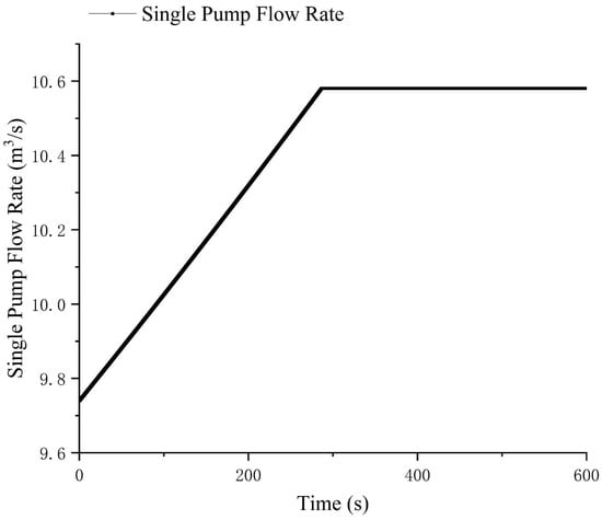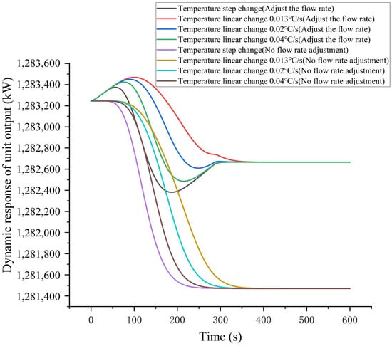 The back pressure response of the condenser and unit load output are analyzed with seawater temperature changes. Using the example of circulating water temperature changing from 2 °C to 4 °C, with temperature change rates of 0.013 °C/s, 0.02 °C/s, and 0.04 °C/s, as shown in the previous sections, the circulating water pump flow rate after frequency conversion is illustrated in Figure 16. The response time from seawater temperature change to condenser inlet is about 50 s, with a total response time of approximately 287 s. Faster seawater temperature fluctuations lead to quicker circulating water transfer. Frequency conversion flow regulation results in faster temperature transfer compared to fixed-frequency flow regulation, as shown in Equation (46):