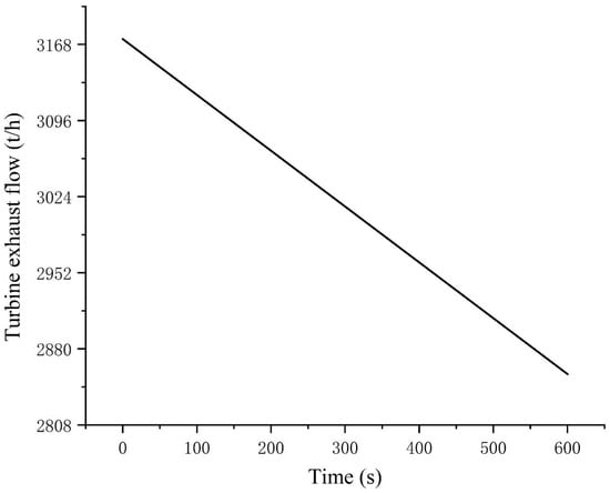 The response of the cooling water system to coupled disturbances of turbine exhaust steam flow and circulating water temperature is analyzed. The exhaust steam flow decreases linearly from 0 to 600 s, as shown in Figure 23, while the circulating water temperature rises from 2 °C to 4 °C at 100 s with rates of 0.013 °C/s, 0.02 °C/s, and 0.04 °C/s, as shown in Figure 24, with circulating water flow maintained at a fixed frequency.