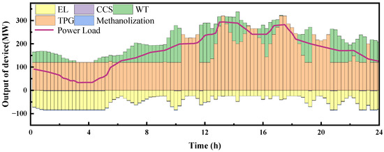 The results of the scheduling optimization indicate that the primary energy supply for the P2M system is derived from the TPG, while the WT serves as a supplementary energy source. On the energy consumption side, after meeting the electrical load requirements, surplus electrical energy is primarily utilized by the electrolyzer, with a small portion allocated to the CCS. The power generation of the WT is influenced by wind speed, exhibiting significant volatility. As a result, it cannot provide continuous and stable energy to the P2M system and serves only as a supplementary energy source. The electrolyzer, as a flexible power-consuming device, operates at higher power levels when the wind turbine output is elevated. Additionally, during nighttime, when the power demand of the electrical load is lower, the electrolyzer assists in maintaining the minimum operational power of the TPG. The combined output of the TPG and WT enhances renewable energy utilization and stabilizes the output of the thermal power unit.