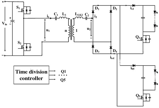 The structure of the proposed LED driver is shown in Figure 1. It consists of a resonant CLL-C converter as the first stage and the time-division controlled switches (–) as the second stage. In the first stage, the CLL-C converter, operating at resonant frequency, provides a constant current while achieving ZPA for the input impedance, ensuring that all the switches and diodes have ZVS and ZCS. In the second stage, the switches to are controlled by a time-division technique to adjust the running time of each LED string. As a result, the total output current is shared equally among each LED string.