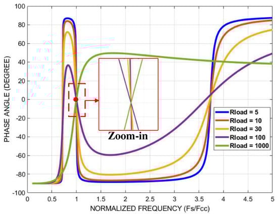 Phase angle of the input impedance versus the operating frequency under different load conditions.
