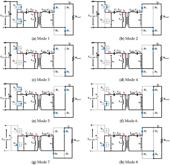 The working principle of the proposed converter can be divided into eight modes. Figure 6 shows key waveforms of currents and voltages of switches and diodes, and Figure 7 shows the equivalent circuits of the proposed converter in different modes of operations. The following assumptions are made to simplify the analysis: All the components are ideal. The transformer has a turns ration of n:1 where n is the primary-side turn number. The leakage inductor is placed in the secondary side.
