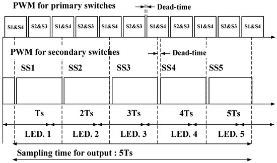 Figure 8 shows the PWM scheme for the second stage of the proposed converter using TDMC for five-channel LED drivers. The working principle of the TDMC method can be explained as follows. The primary-side resonant converter is performed at the constant current resonant frequency of for the primary switches to provide a total constant current Itot for all five LED strings. The secondary stage switches work at the frequency of In order to balance LED output current, all of the outputs are regulated in one sampling time (). In one interrupt cycle, only one secondary switch is turned on to allow the primary side to operate. It means that, one second-stage switch will operate with the duty cycle of nearly 20% and the shifted phase between the switches of two adjacent channels is nearly 72 degrees. As a result, all output currents ( to ) have the same value and the output voltage − of each channel will then settle to the value that makes its average current value equal to , ignoring the current and voltage ripple within the switching period. In the proposed method, the total output is required to regulate constant. Thus, it is possible to provide numerous output channels with highly precise regulations.
