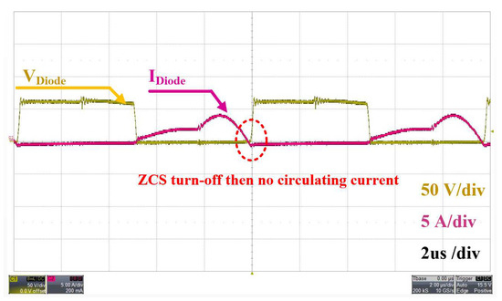 Figure 11 shows the experimental waveform of primary-side MOSFETs under the maximum output power of 200 W. It is clear that the MOSFETs are turned on with the ZVS condition and turned off with the nearly ZCS condition. The turn-off current is small, just 0.3A. Meanwhile, Figure 12 shows the waveforms of the rectifier diodes in the secondary side. Similarly, ZCS turn-off of the rectifier diodes can be observed from Figure 12, hence there is no circulating current, which reduces the losses of the proposed converter.
