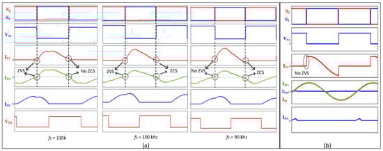 To illustrate this, Figure 11a depicts the soft-switching behavior at different switching frequencies, where ZVS is lost at lower frequencies while ZCS disappears at higher frequencies. Similarly, Figure 11b shows the converter performance under very light load conditions, where ZVS is lost, leading to hard switching.