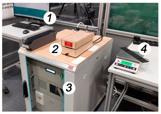 A measurement station equipped with an SST (Single Strip Tester). (1) Monitor screen displaying results, (2) measuring system yoke, (3) power supply controlled by the measuring computer, (4) measuring scale with a 60 mm wide strip placed on it.