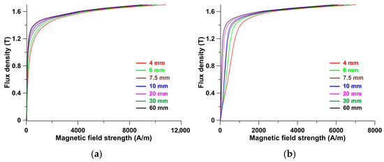 The previously determined local curves of magnetization and specific iron loss were used to calculate curves for materials with equivalent properties. These materials were located in different zones of the FEM model. The FEM model defined three zones of different materials, each located at various distances from the cut edge, as follows: 0–1 mm, 1–2 mm, and 1–3 mm. For zones located at greater distances, the material property was assumed to be similar to that of undamaged material. The FEM model for punched material will then assume two zones with different materials, each described by equivalent properties, namely zone 1, extending from 0 to 1 mm from the cut edge, and zone 2, extending from 1 to 2 mm. The material in zone 3 that extended more than 2 mm from the cut edge was considered undamaged. In the case of laser-cut material, three zones (with equivalent material properties) have been assumed, as follows: zone 1 extending from 0 to 1 mm from the cut edge, zone 2 from 1 to 2 mm, and zone 3 from 2 to 3 mm. The undamaged material was considered for distances greater than 3 mm (zone 4). Magnetization curves (Figure 7) and specific iron loss curves at 50 Hz (Figure 8) were calculated for each zone.