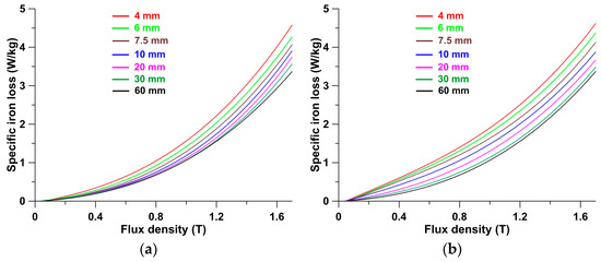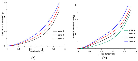 Specific iron loss curves adopted for individual zones of the FEM model. (a) Punched laminations, (b) laser-cut laminations.