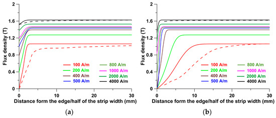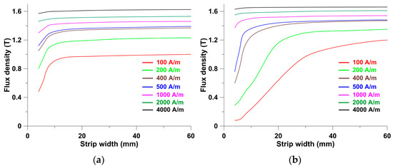 Local magnetic induction was reproduced using the measurement results (flux density averaged over the strip cross-section) shown in Figure 4 as a family of curves B = f(w), where w is the width of the rectangular strip being tested. As mentioned earlier, each of these curves was plotted for a particular maximum magnetic field strength on the strip surface. Thus, they are the curves that describe the material’s average magnetic permeability as a function of strip width. It should be mentioned that the M300-35 material was tested in another measurement campaign. As a result of the campaign, several test results for this material were presented, including curves that describe both local (reproduced) and average (measured) induction [23]. As stated in (1), the magnetic induction averaged over the strip cross-section for a given magnetic field strength can be directly related to the distribution of local induction by using the following relationship: