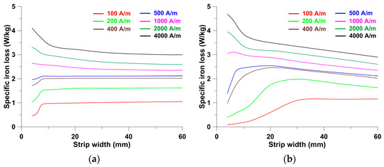 Measured family of specific iron loss curves for the M300-35 material, obtained at 50 Hz. (a) Guillotine-cut strips, (b) laser-cut strips.