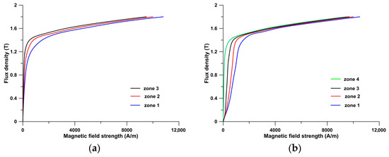 Magnetization curves adopted for individual zones of the FEM model. (a) Punched laminations, (b) laser-cut laminations.