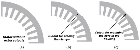 Geometry of the quarter of the stator core. (a) Core without any additional cutouts, (b) core with cutouts for clamps, (c) core with cutouts for installation in the housing.