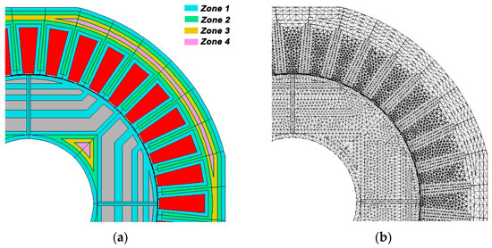 Three FEM models were created, each with a different stator geometry (Figure 10). Model 1 has no technological cutouts in the stator core (Figure 10a), which is consistent with other researchers’ descriptions of SynRM motor models. Models 2 and 3 have stator cores with technological cutouts, as shown in Figure 10b,c, respectively. A comparison of the computer simulation results for these models will clearly demonstrate the effect of technological cutouts on motor parameters. Each of these models may account for the presence of damaged material zones caused by shaping the stator and rotor lamination geometry. Section 2.1 discussed the location and number of these zones, which differed depending on the cutting technology used. This topic was discussed in relation to the method for determining equivalent material properties in specific zones of the stator and rotor cores. The computer simulation results obtained for Model 1, which do not account for changes in material properties, will be used to compare with other obtained simulation results. Based on the available material test results, it is known that changes in material properties caused by cutting occur continuously in space. However, incorporating this fact into the FEM model necessitates the use of specialized software tools. The author used professional FEM software that does not permit interference with the software code. That is why this approach cannot be used. As a result, the zones mentioned in Section 2.1 were created with a width of maximum 1 mm in the FEM models used, as shown in Figure 11a. It was assumed that the distance from the cut edge determines the degree of material degradation caused by the cutting process. Thus, the FEM model’s number of zones is proportional to the actual width of the magnetic circuit fragment. For example, the stator tooth is 3.6 mm wide. The FEM model will, therefore, include zone 1 with a width of 1 mm and zone 2 with a width of 0.8 mm. For the stator yoke, the FEM model includes zones 1, 2, and 3, each 1 mm wide, as well as zone 4, whose width is determined by the complement of the yoke width. The material in these zones is described by equivalent material characteristics, as discussed in Section 2.2. The built FEM models had a denser mesh in critical areas, like the air gap, stator teeth, and rotor ribs (see Figure 11b). The air gap was divided into three layers. This allowed for the use of a solver that took into account the rotor’s free rotation as a result of the generated reluctance torque. The solver thus permitted free rotor positioning relative to the stator winding’s magnetic field vector, which corresponded to the given average load torque. The FEM models also included circuit equations. In this manner, the simulation took into account that the stator windings were powered by the rated sinusoidally alternating voltage.