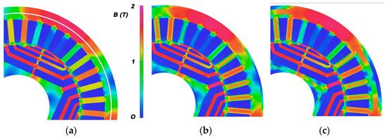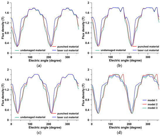 Calculations for each type of FEM model were carried out in three ways. The first one ignored material destruction. The second took into account the destruction of a portion of the material due to punching, and the third took into account the destruction caused by laser cutting. The destruction of a material was considered by defining three or four zones with various materials, as described in Section 2.2 and illustrated in Figure 11a. Figure 12 shows the numerical simulation results for the spatial distributions of the instantaneous flux density in model_1, Figure 13 depicts distributions in model_2, while Figure 14 depicts distributions in model_3. In turn, Figure 15 compares the instantaneous flux density distributions along a path located at the mid-height of the stator yoke (white arc shown in Figure 12a) for the three types of FEM models. To determine if the torque ripple level is solely influenced by the shape of the instantaneous flux density distributions curve (Figure 15), the maximum flux density values in any part of the stator yoke were determined. The calculations were carried out for the three analyzed stator core shapes, taking into account the presence of damaged material. The results are shown in Table 2.