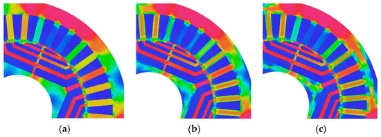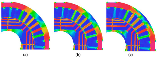 Instantaneous flux density distributions in model_3. (a) Only undamaged material, (b) partially damaged material—punching, (c) partially damaged material—laser cutting.