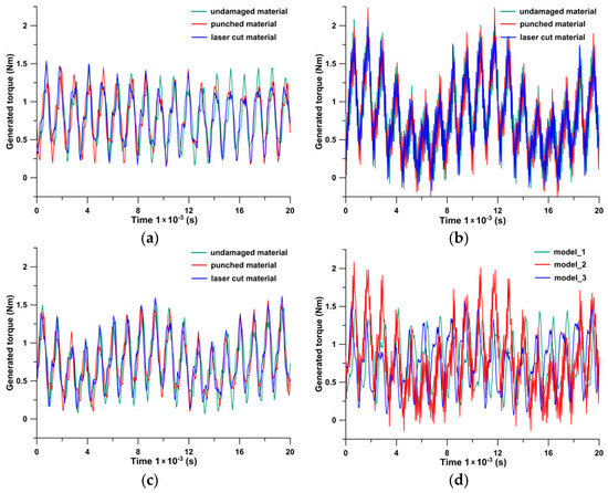 The calculated waveforms of the generated torque. (a) Model_1, (b) model_2, (c) model_3, (d) comparison of torque waveforms for model_1, model_2, and model_3 (for undamaged material).