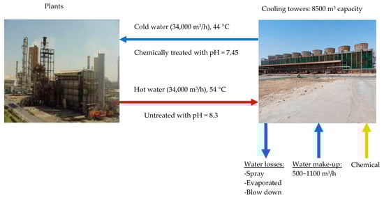 The cooling towers at the Southern Fertilizers Company in Iraq cool the circulating water coming from the plants and treat it to make it suitable for the industrial process. The cooling tower capacity is 8500 m3, the inlet water temperature is 54 °C, and the outlet water temperature is 44 °C. The circulating water has a flow rate of 34,000 m3/h. The circulating water entering the cooling towers is hot and alkaline, with a pH of 8.3, while the circulating water exiting the cooling towers is cold and neutral, with a pH of 7.45. Figure 1 shows the relationship between the cooling towers and the plants.