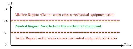 The Mitsubishi pH operating range for cooling water is around 7.1 to 7.8. When the pH is less than 7.1, the cooling water becomes acidic, which causes corrosion of mechanical equipment. Conversely, when the pH exceeds 7.8, the cooling water becomes alkaline, leading to scale formation. There is no effect on the mechanical equipment when the pH of the cooling water is neutral. Figure 2 shows the effects of pH on the plant’s mechanical equipment.