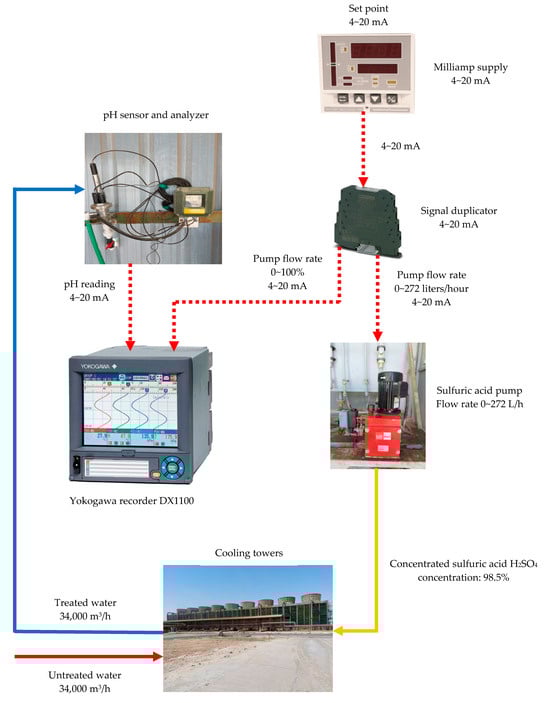 Cooling towers are heat rejection systems based on the principle of extracting waste thermal energy from hot water and releasing it into the atmosphere using relatively cool and dry air []. Cooling towers enhance productivity and efficiency in industrial machines. Inadequate water treatment leads to corrosion and scaling in pipelines and basins, causing suboptimal heat transmission and ineffective cooling towers []. The pH parameter is a significant factor in industrial cooling towers. The pH level indicates the cooling water’s acidity (when the pH is less than 7.1) and alkalinity (when the pH is more than 7.8). Acidic cooling water causes corrosion of mechanical equipment, while alkaline cooling water leads to scale formation on mechanical equipment []. Corrosion poses a significant concern in contemporary industrial and maritime settings, as it can rapidly deteriorate metals through chemical and electrochemical oxidation and reduction processes []. The onset of corrosion, moss, and crustal deposits may prohibit heat transfer and disrupt the cooling tower’s thermal effectiveness. This not only diminishes thermal efficiency but may also harm the cooling towers []. As water vaporizes from the cooling tower, particulates are left behind, resulting in increased concentration of the cooling water, which may subsequently lead to scale deposition on heat transfer surfaces. The hardness and silica ions act as the most challenging particles responsible for producing scale in cooling tower water []. Thus, pH regulation in cooling towers is very important for maintaining neutral cooling water and preventing corrosion and scale formation on mechanical equipment []. The proportional–integral–derivative (PID) controller, already known for its stability, is a widely adopted control strategy in industrial applications. PID control is widely recognized for its simplicity, efficiency, and reliability []. The PID controller can perform the pH value neutralization of cooling water to maintain it within the operating limit [,,]. The pH neutralization process is a complex nonlinear time-delay system that poses challenges for control and precise mathematical modeling. Consequently, the data-driven approach, which requires a dependable experimental dataset to depict process dynamics accurately, is frequently employed []. To execute the neutralization process and assess pH control, it is essential to compute the transfer function of the pH loop using the PID controller. The dataset must be recorded to calculate the system’s transfer function. A dataset was constructed utilizing online sensor monitoring data and cooling water quality analysis data as input features. Neutralizer pH was used as an output feature for pH prediction, and valve position was used as an output feature for dose management. The recorded raw data appeared in an open-loop dataset. All data were recorded online for fixed time intervals []. The primary problems of pH control systems include significant nonlinearity and temporal variability in the pH neutralization process and unpredictability in plant dynamics. A variety of advanced PID tuning techniques are available. Nevertheless, traditional tuning methods continue to be useful in several sectors. The comprehensive control strategy entails regulating the flow rates of acid and basic solutions. The MATLAB Tuner approach also applies to the pH neutralization control model []. Despite traditional methods in PID controller tuning, modern methods are used to optimize the PID controller parameters []. Conventional PID controllers struggle to provide optimal control outcomes for complex systems characterized by significant lag, temporal unpredictability, strong coupling, and nonlinearity. An adaptive fuzzy PID composite controller performs online self-tuning of its parameters []. A strategy for correcting PID parameters in real time for fuzzy control has been proposed to address the challenge of adjusting traditional PID control parameters. PID parameters are adapted in real time by fuzzy inference []. A fuzzy-based PID controller requires error and changing error rates as inputs to produce PID parameters as output. The fuzzy rule set operates to control the PID parameters. The findings indicate that the rise time, settling time, and overshoot decline in comparison to using PID control []. Neural networks (NNs) integrated with fuzzy inference systems (FISs) produce the adaptive neuro-fuzzy inference system (ANFIS) to solve optimization problems. Artificial neurons are the fundamental processing components of neural networks. The ANFIS controller can autonomously learn and adjust to the plant’s condition [,,]. The ANFIS is integrated with a PID controller to optimize its performance. The proposed control strategy utilizes ANFIS’s adaptive and intelligent tuning capabilities to enhance the parameters of the PID controller []. The PID-ANFIS controller with adaptive tuning parameters is effective for nonlinear, closed-loop systems []. Metaheuristic algorithms such as particle swarm optimization (PSO) are also used to optimize the parameters of the PID controller []; they calculate the Kp, Ki, and Kd parameters to achieve the optimal system’s performance []. This algorithm is more reliable in achieving the lowest error, where the objective function is the integral of time multiplied by absolute error (ITAE) [].