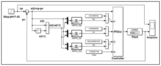 Table 7 shows the PID controller parameter values obtained using MATLAB Tuner, where Kp = 4.01446743, Ki = 0.00094926, and Kd = 2053.88283792. These parameters provide a good pH response. Figure 23 illustrates the PID controller block diagram based on MATLAB Tuner. Figure 19a displays the pH response in black. The performance of the pH response based on MATLAB Tuner was as follows: rise time = 7.4786 × 104 s, settling time = 3.5006 × 105 s, and overshoot = 0.5465%, as mentioned in Table 8. The PID controller parameters were fine-tuned to improve the black pH response. The fine-tuning process involves adjusting the PID controller parameters obtained from MATLAB Tuner. The fine-tuning element is the MANFIS. Figure 16 presents the PID controller block diagram based on the MANFIS Tuner. Using the MANFIS Tuner improved the pH response, resulting in a rise time = 5.1276 × 104 s, settling time = 1.1131 × 105 s, and overshoot = 0.3171%, as mentioned in Table 8. The overshoot, rise time, and settling time decreased with the use of the MANFIS Tuner. Table 9 shows the RMSE for each MANFIS output, where ∆Kp_RMSE = 0.695383, ∆Ki_RMSE = 1.3862 × 10−6, and ∆Kd_RMSE = 138.72. These values were calculated using the MATLAB “anfisedit” instruction, with an epoch of 350. The pH response after fine-tuning based on the MANFIS Tuner is shown in blue in Figure 19a.