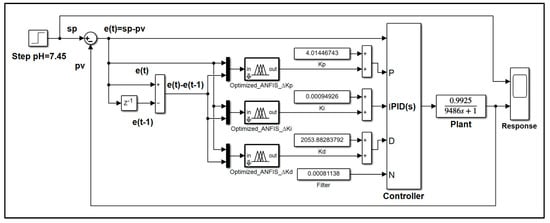 PSO was used to optimize the MANFIS parameters and create the PSO–MANFIS Tuner to find the best pH response. Table 9 shows the RMSE for each MANFIS output optimized using the PSO algorithm, where ∆Kp_RMSE = 0.34338, ∆Ki_RMSE = 7.2193 × 10−7, and ∆Kd_RMSE = 70.7642 with iterations = 1000. The RMSE for each MANFIS output was reduced using the PSO algorithm. The MANFIS based on PSO optimization is called optimized MANFIS. The PSO–MANFIS technique was used to optimize the PID controller parameters obtained by MATLAB Tuner. Figure 18 shows the PID controller block diagram based on the PSO–MANFIS Tuner. The red curve in Figure 19a represents the best pH response using the PSO–MANFIS Tuner. The pH response performance includes a rise time of 5.1719 × 104 s, a settling time of 1.1200 × 105 s, and an overshoot of 0.2582%, as mentioned in Table 8. The rise time and settling time are greater than those using the MANFIS Tuner, with only a slight difference, but the overshoot is lower.