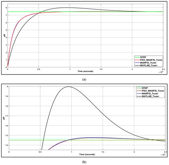 As a summary of the results and discussion, Figure 19a shows three curves representing the pH responses of the PID controller based on three tuning methods: MATLAB Tuner, MANFIS Tuner, and PSO–MANFIS Tuner. The black pH response is from the MATLAB Tuner, the blue pH response is from the MANFIS Tuner, and the red response is from the PSO–MANFIS Tuner.