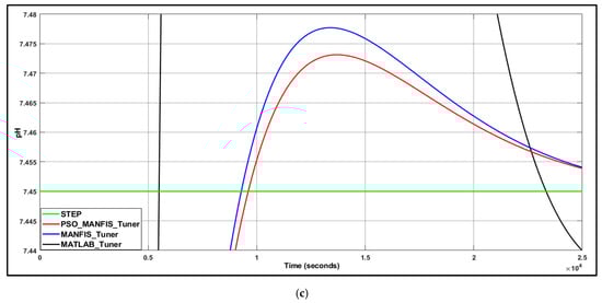 Figure 19a shows that the blue curve based on the MATLAB Tuner is approximately identical to the red curve based on the PSO–MANFIS Tuner because their performances are nearly identical. Figure 19c is an enlarged representation of Figure 19a. In Figure 19c, the difference between the blue and red curves is clear, where the overshoot in the red curve is less than that in the blue curve. Figure 19b shows the difference in overshoot among the three curves (black, blue, and red), showing the effect of the three PID controller tuning methods on the pH response’s performance.