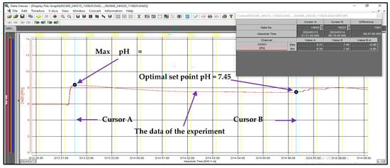 - Collecting pH data from the maximum pH (8.31) to the optimal set point (7.45). The experimental data are between cursors A and B of the Yokogawa Data Viewer software. Figure 20 displays the real-time pH data between cursors A and B using the Yokogawa Data Viewer software. Figure 21 shows the real-time pH data obtained from the titration circuit in an Excel file.