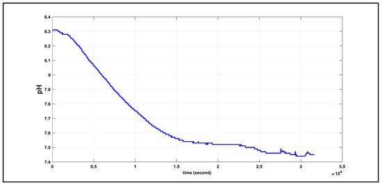 Figure 22 shows the approximated real-time pH data. The approximation was performed using the System Identification Toolbox in MATLAB. The fitting rate was 87.68%, and the final prediction error (FPE) was 0.00114331, as shown in Table 5. The approximation results described above are acceptable. Table 6 shows the FOPDT variable values obtained through the approximation activity, where the gain is 0.9925, the time constant is 9486 s, and the dead time is 0. This means that the pH model does not have dead time. The pH model was calculated based on Equation (4).