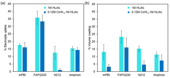The results from electrolyte uptake experiments and volume changes that membranes undergo after being immersed in both the supporting electrolyte and the CoW12 electrolyte are shown in Figure 1. Figure 1a shows that for all cases, the electrolyte uptake is slightly higher when membranes are immersed in the supporting electrolyte than that displayed by those immersed in the POM-based electrolyte. FAPQ330 exhibits the largest electrolyte uptake, both in the supporting electrolyte (35.8 ± 4.4%) and the CoW12 electrolyte (33.2 ± 5.0%). Conversely, mPBI and Amphion show lower uptake values than FAPQ330: 17.6 ± 1.0% in the supporting electrolyte and 16.0 ± 3.5% in CoW12 for mPBI, and 15.4 ± 1.3% in the supporting electrolyte and 14.3 ± 1.7% in CoW12 for Amphion. Finally, N212 exhibits the lowest uptake and, in contrast to the other membranes, considerably decreases in the presence of the POM (12.5 ± 4.3% vs. 0.9 ± 1.0%, respectively). This effect can be attributed to the electrostatic repulsion between the polyanion and the negatively charged polymeric backbone of the CEM N212.