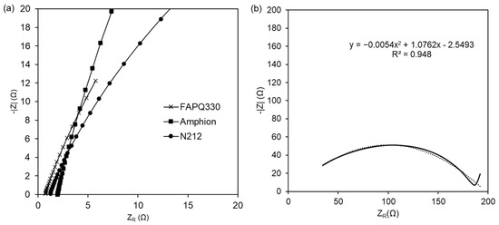 (a) Nyquist plot for the impedance data of the membranes immersed in CoW12 electrolyte. Example of the results obtained for one membrane. (b) Nyquist plot for the impedance data of mPBI immersed in CoW12 electrolyte. From the fitted GEIS spectra, the extracted value is Rs = 2.4 Ω, which results in a 0.4 mS cm−1 conductivity of the membrane (17.5 µm thickness) after being immersed in the CoW12 electrolyte.