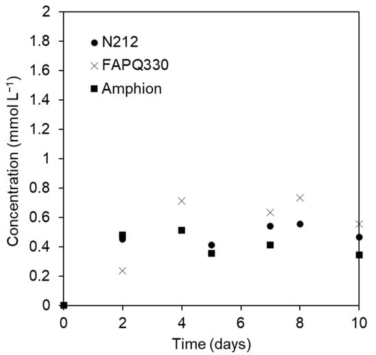 Another important property to take into account when choosing a membrane for an RFB is its selectivity. The selectivity of the membrane must favor the transport of the ions in the supporting electrolyte to balance the charges and impede the crossover through the membrane of the electroactive species. A poor selectivity of the membrane can be translated into a large self-discharge of the battery and, hence, efficiency losses [30]. The diffusion tests performed for all the membranes revealed negligible diffusion of the CoW12 electroactive species: Figure 3 shows the results of the concentrations measured in the receiving tank over a 10-day period for all membranes. After three days, the concentration of electroactive species remains almost constant at a value close to 0.5 mM. This means that less than 5% of the total electroactive species in the electrolyte passed through the membrane and, what is more important, it remained stable from the third day. With this in mind, all membranes can be deemed suitable for operation in a CoW12 flow cell system due to their negligible crossover. Moreover, the large anionic charge and size of POMs can be considered to significantly decrease the crossover related to diffusion in comparison to vanadium species in VRFBs, which could reach up to 10% in the receiving tank in the same conditions with N212 within the same period of time, but with a concentration of more than 10 times that of the CoW12 electrolyte [48]. Nevertheless, further studies in a flow cell are required to confirm that no other mass transfer phenomena take place through the membrane.